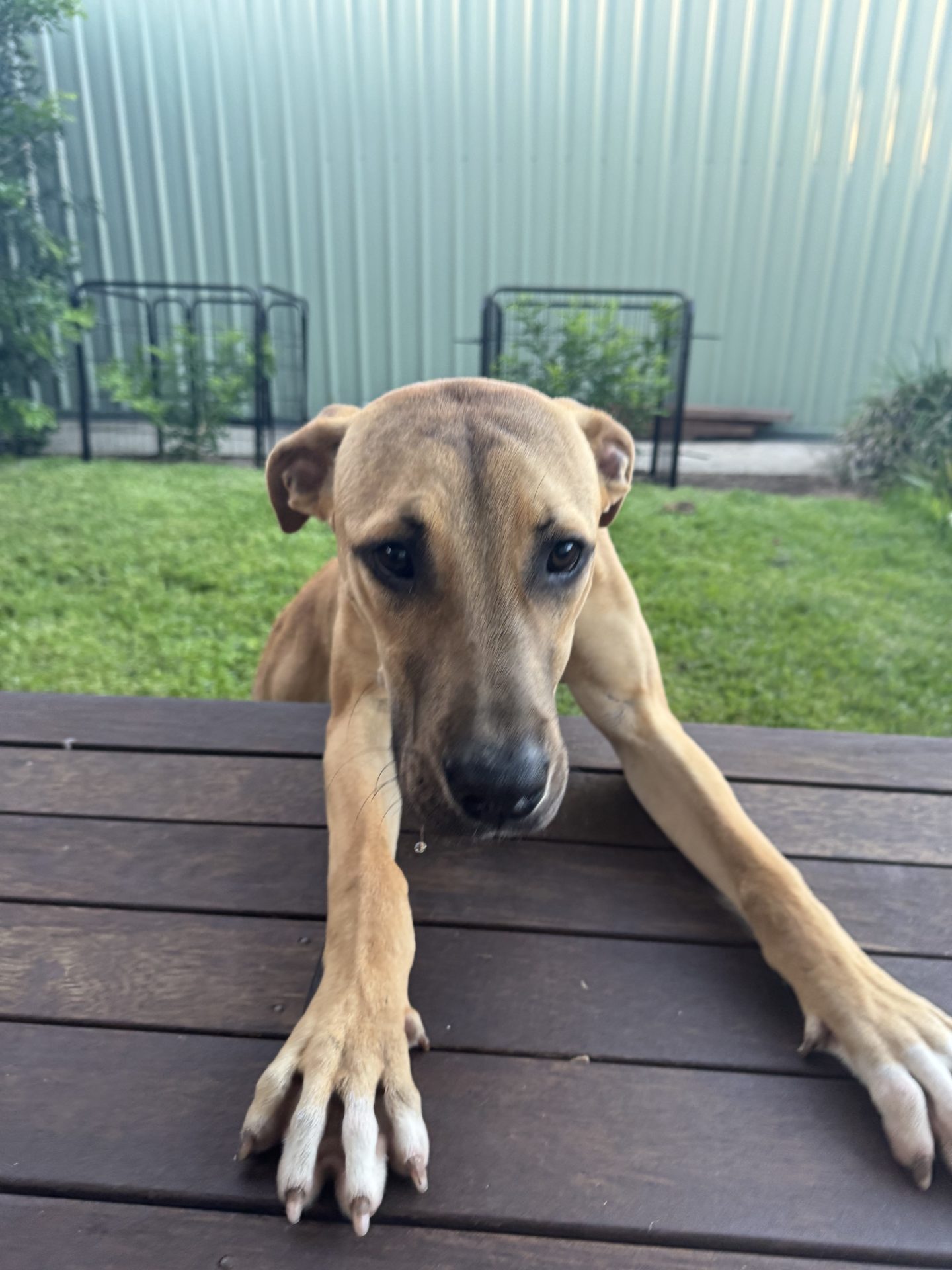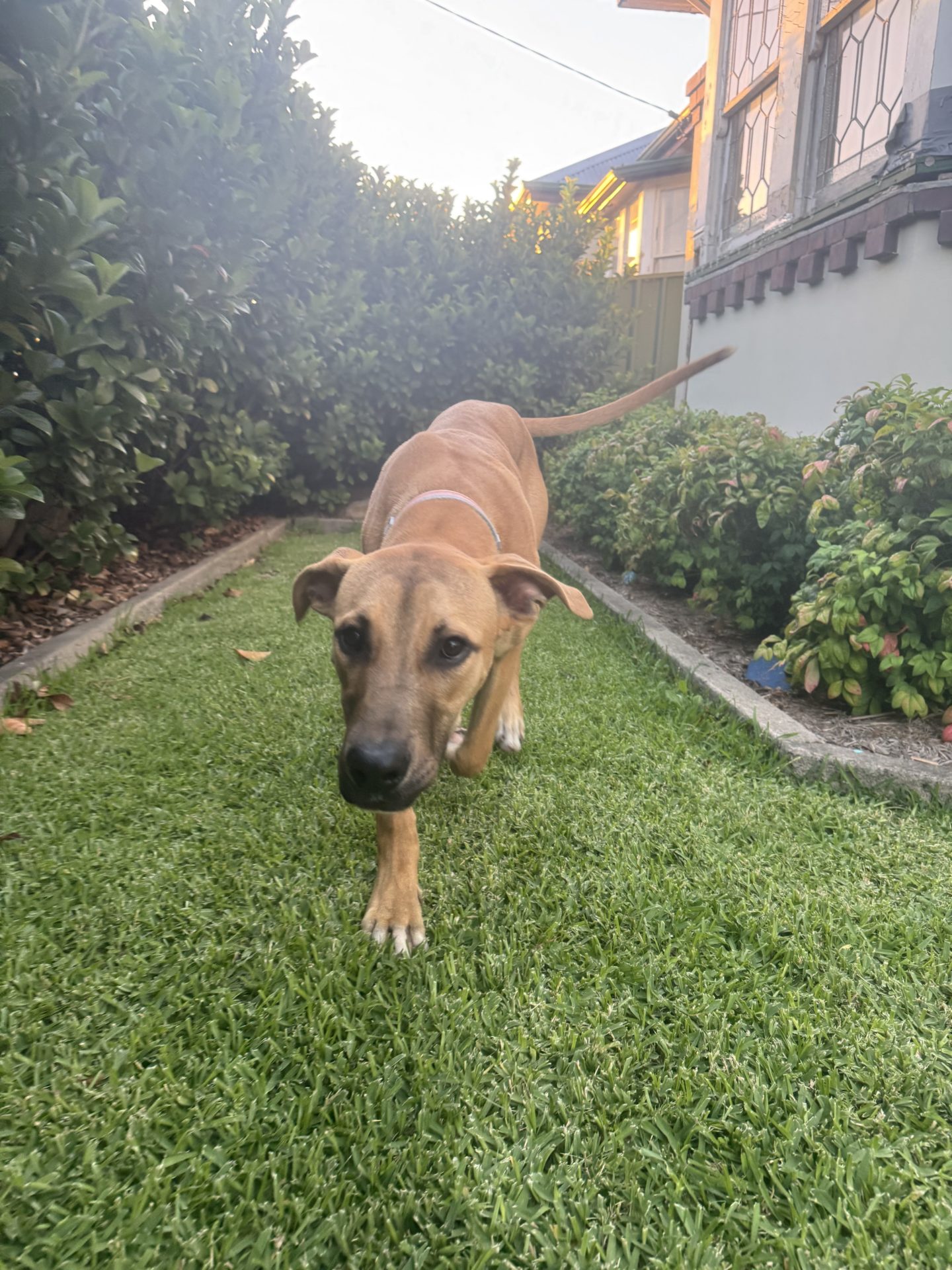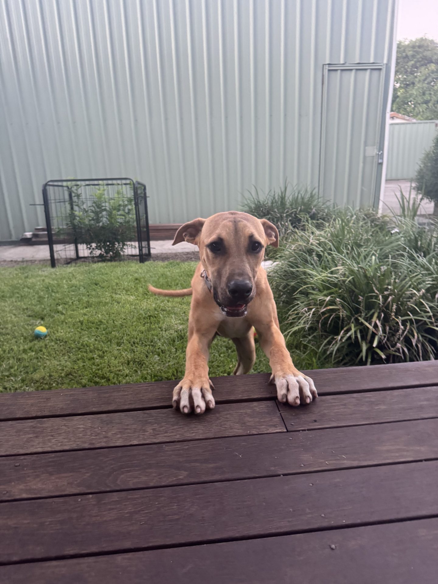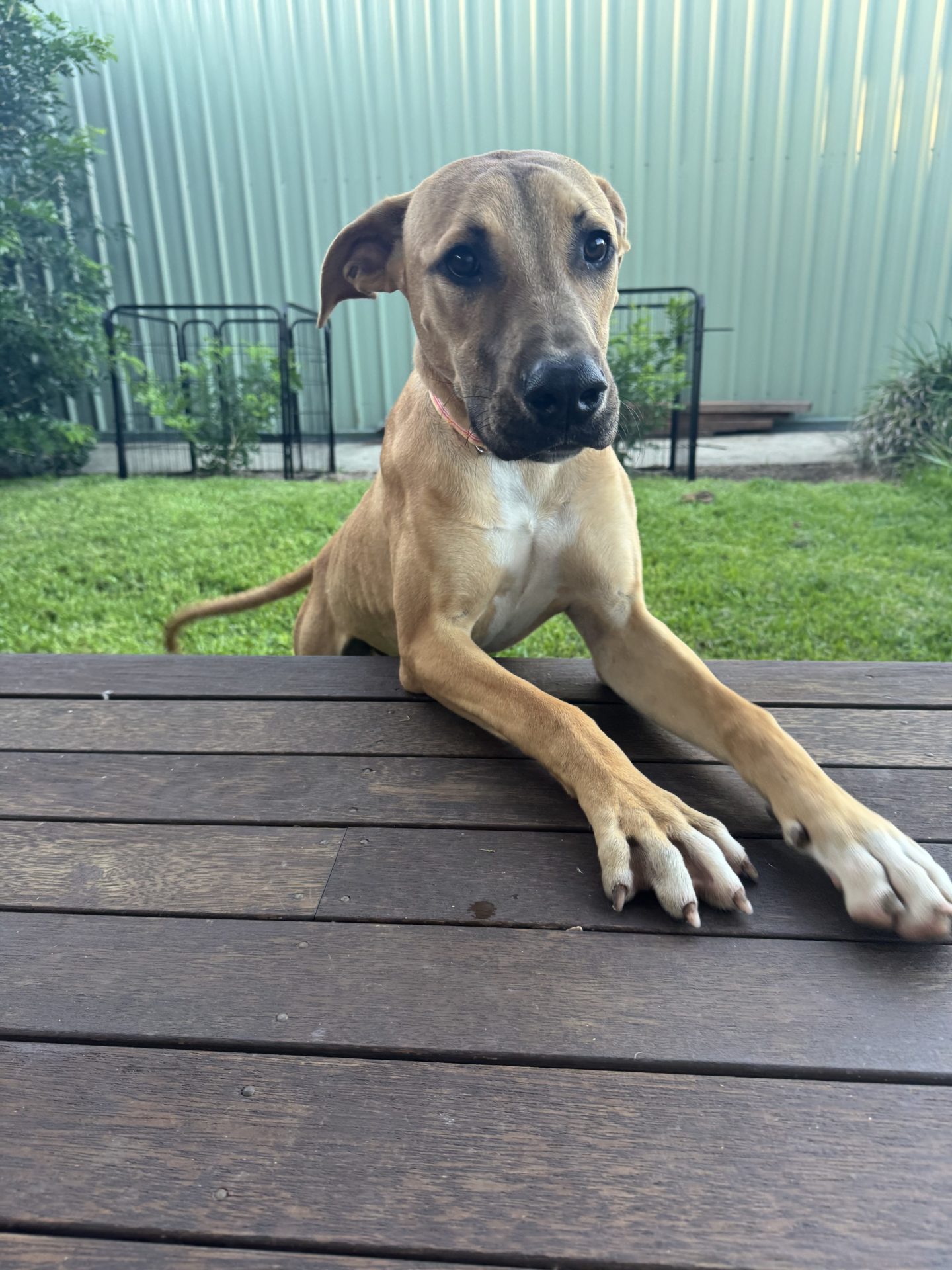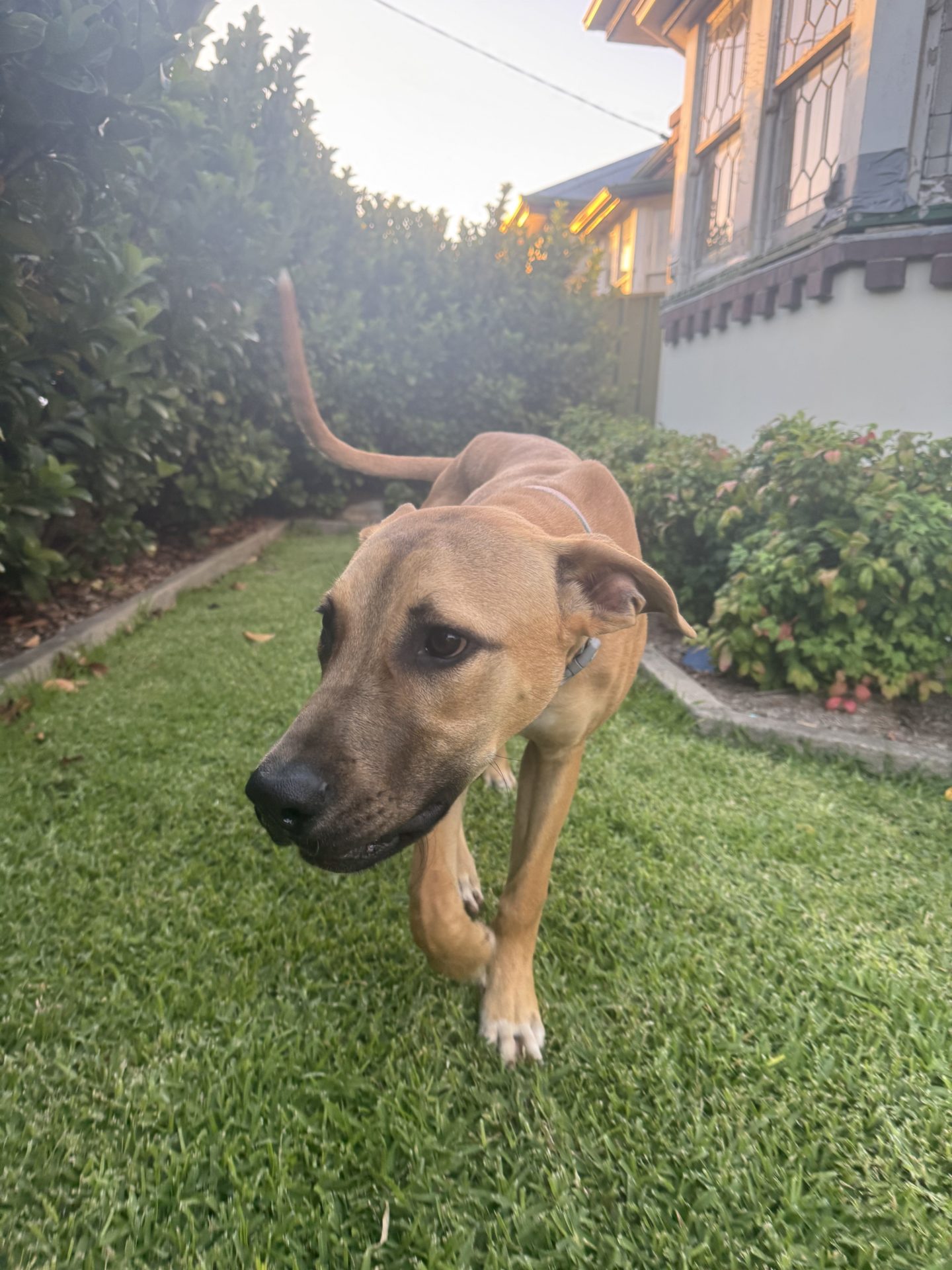 My Ideal Home: Would love a nice big back yard, secured fences. He would love to be part of a family, he likes kids (the tail starts up straight away). Was previously with a family with a toddler, however given his size older kids may be more appropriate.