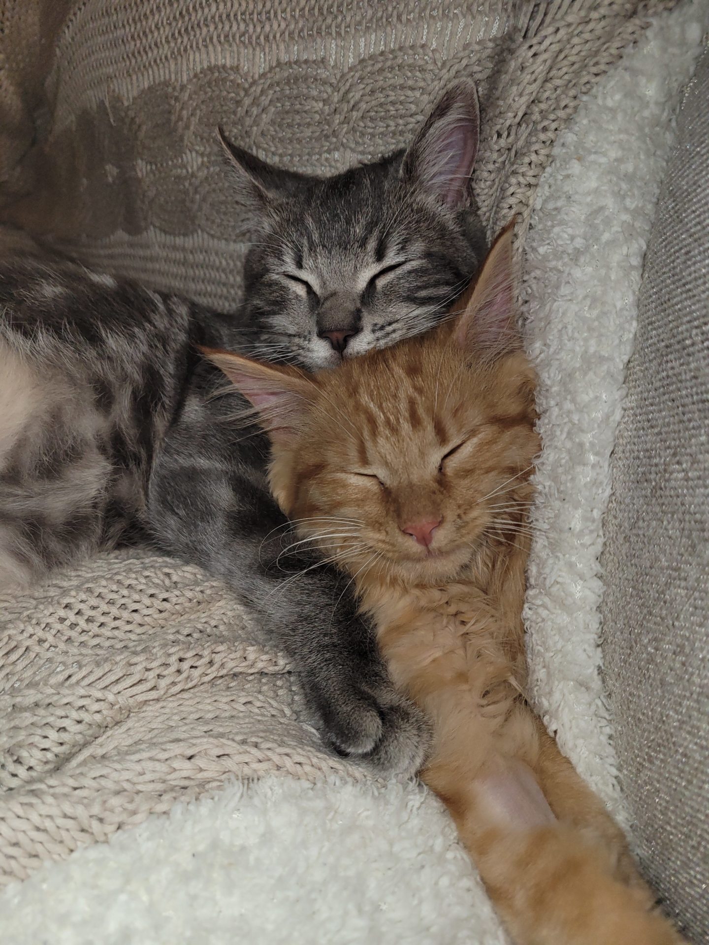 All About Me and My Unique Personality: Billy is the sweetest little fella, he has a Main Coon look about him so who knows what breeding lurks underneath that soft silky coat! He purrs when you pick him up and likes to settle on your lap for a nap. Crazy energy as well. He was released from the pound with Harley (who he is pictured with). They were strangers but we popped them together and the fireworks ensued!!!! They became fast forever friends. After observing their behaviours the pound suggested they go to homes with another cat to learn boundaries with play, which they have. Ideally I would love to see them go together to a home. Vet work is completed.