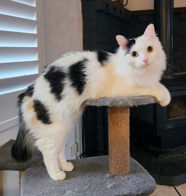 Then there’s Tony: 3½ years old, black-and-white, long-haired, and full of “why walk when you can dramatically flop onto someone” energy. He’s impossibly friendly, hilarious, and fearlessly affectionate — including with small kids who maybe don’t understand personal space. Tony’s motto? “If I fits, I sits... on you.”