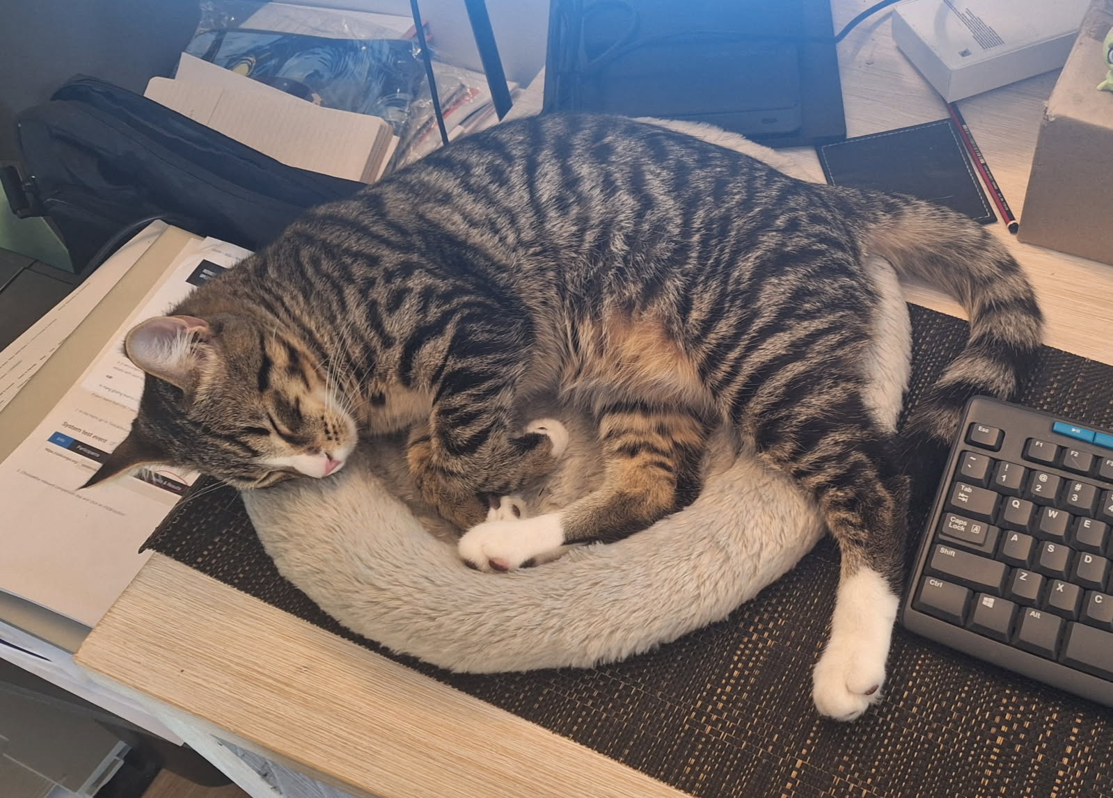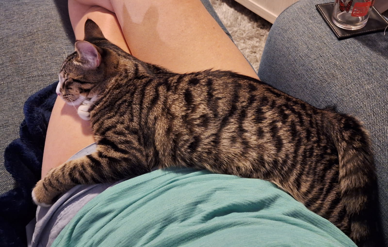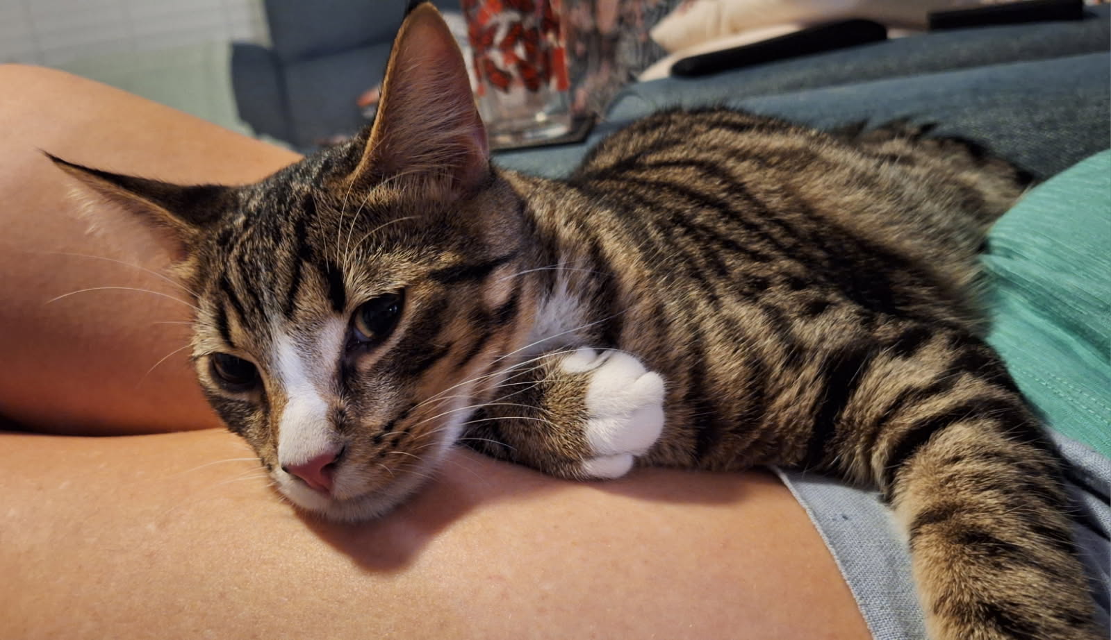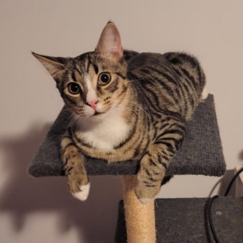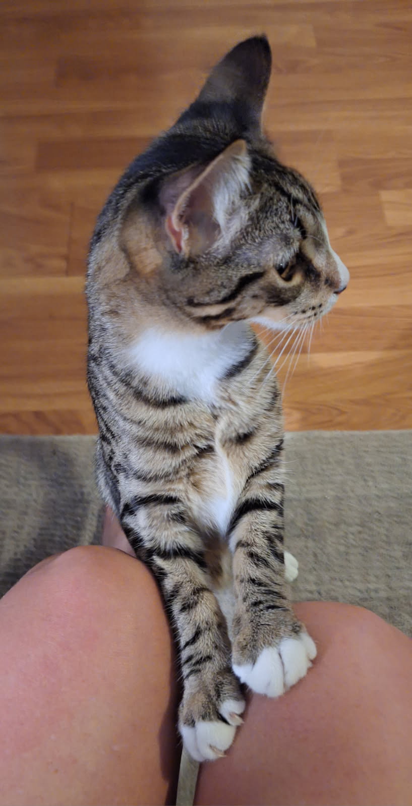 He's up for anything that involves movement - chasing balls, using the jungle gym and cat tower, carrying around his little treasures or watching Muster Dogs on TV.