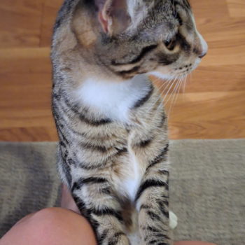 He's very friendly with our gentle dog, rubbing up against him as he walks by.