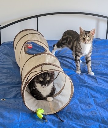How Do I Interact with Kids, Dogs, Cats and Other Pets: They get on well with the other cats in care. They have not yet met a small human or any dogs, but with a slow, gentle introduction would no doubt do fine.