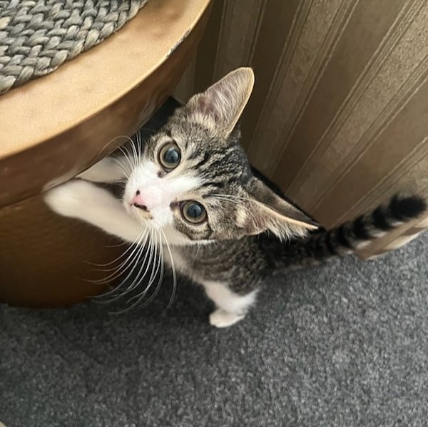 Max is a soft-spoken little sweetheart with the most soulful eyes and a heart full of love. While he may be a bit quiet at first, once he feels safe, he absolutely melts into your arms for cuddles. He’s the kind of kitten who will curl up beside you after a long day and make everything better with his gentle purrs.