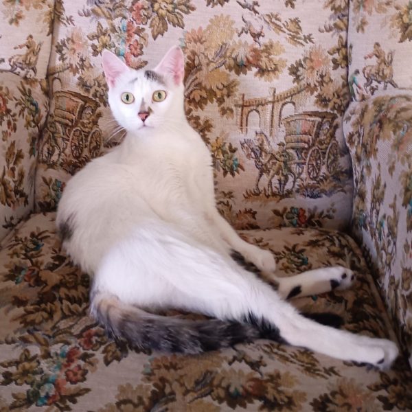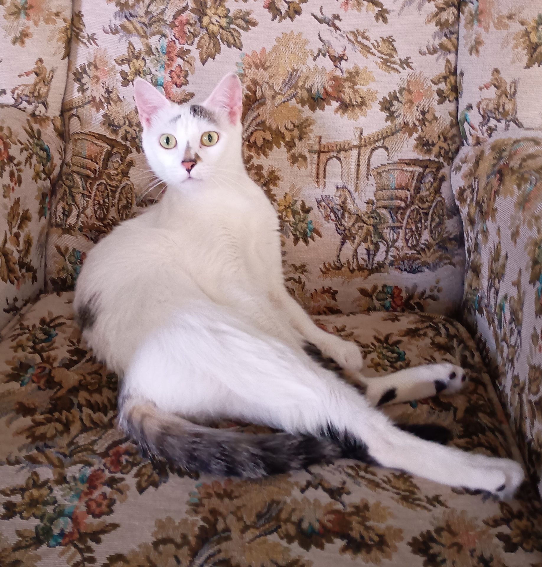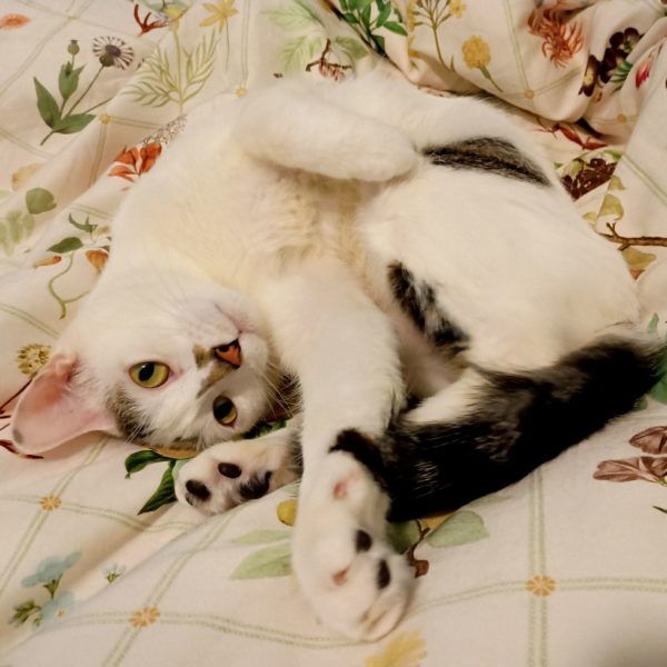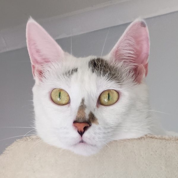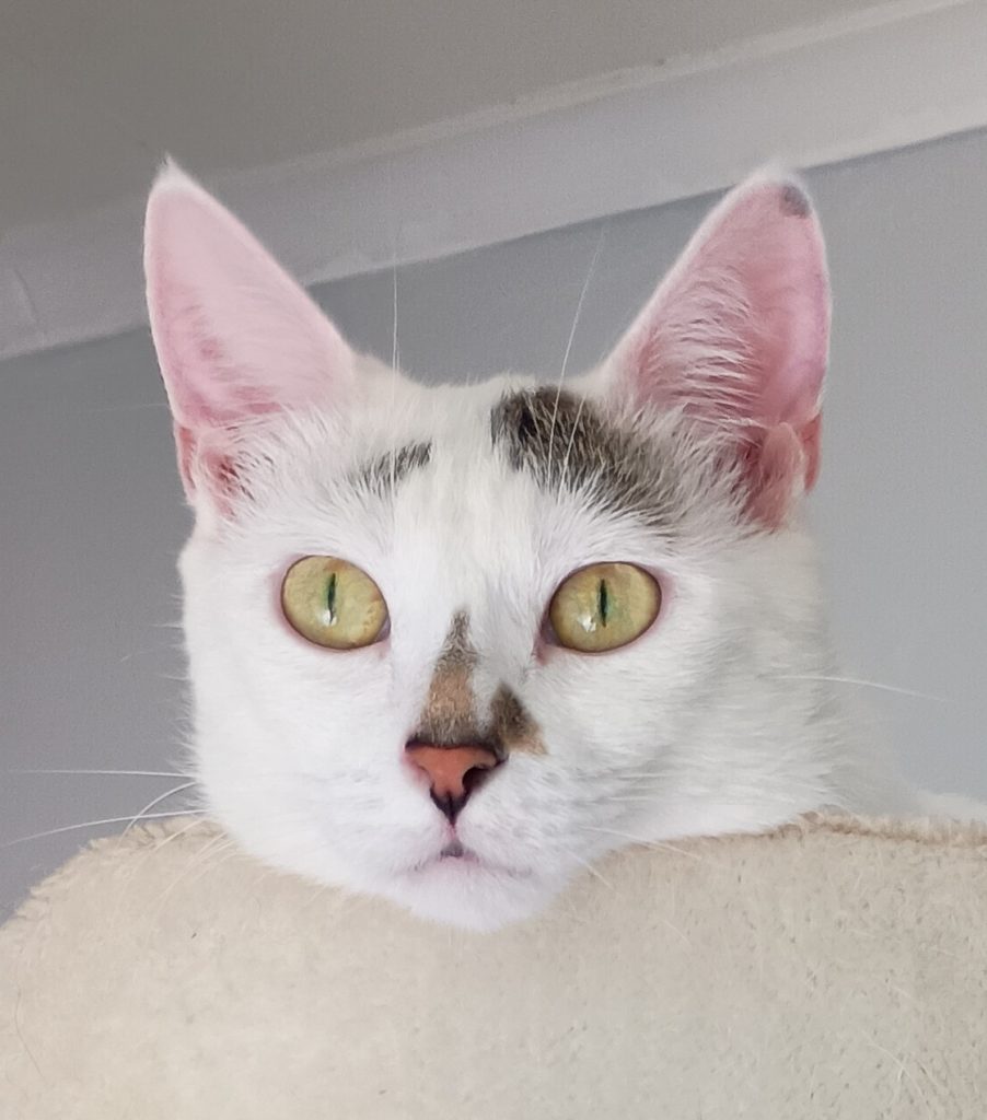 All About Me and My Unique Personality: Her markings may make her look a little worried but she is a surprisingly confident cat, becoming comfortable in her foster carer's home very quickly. She loves chin scratches and napping in bed with you. She is a big purrer and has a soft chirrup of a meow. Like many of us, she dislikes noisy neighbours and will often quietly growl and leave the room if she hears them. However she is quick to come out and see calm guests. Less shy than her son, she a very easy going cat.