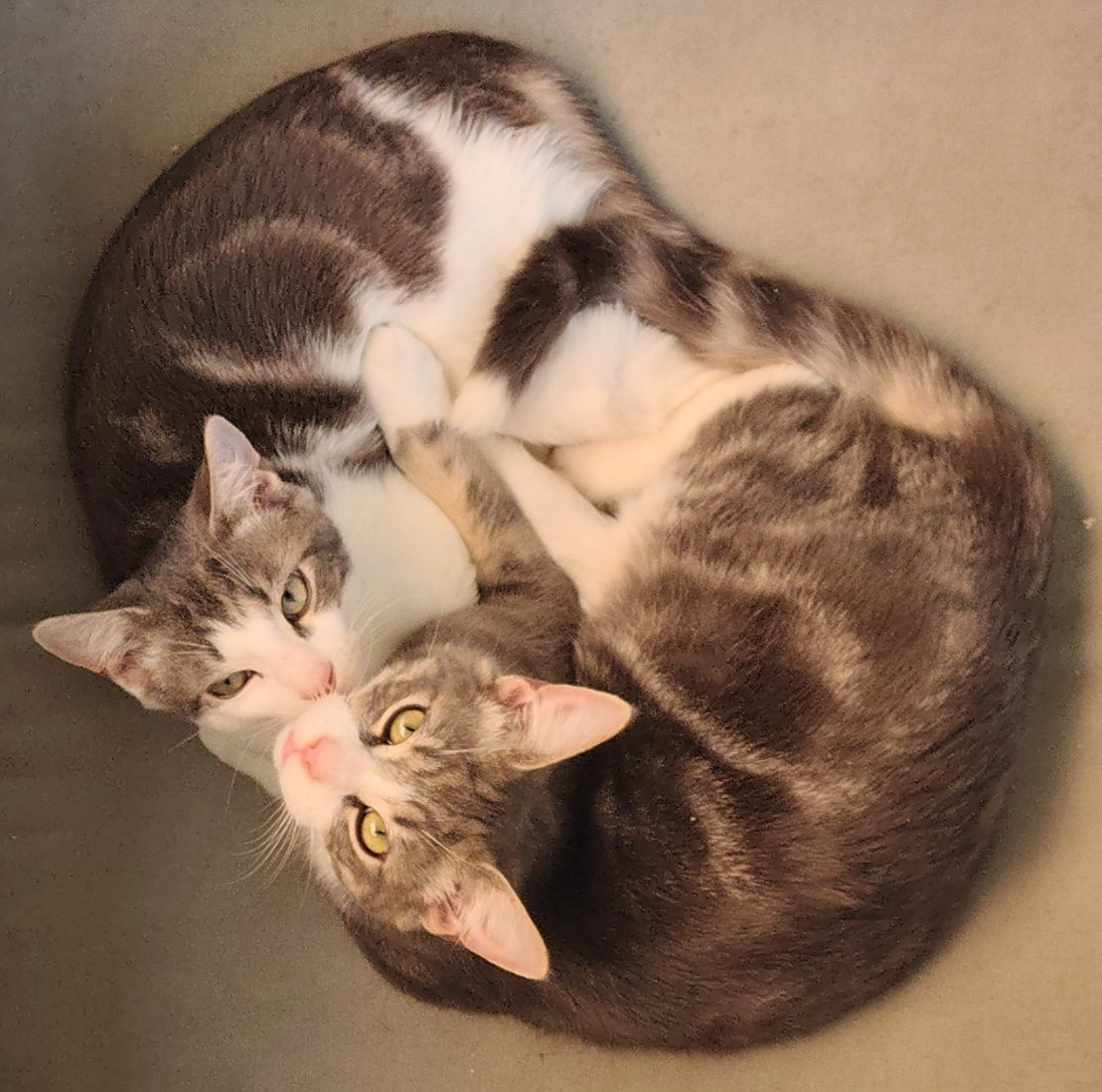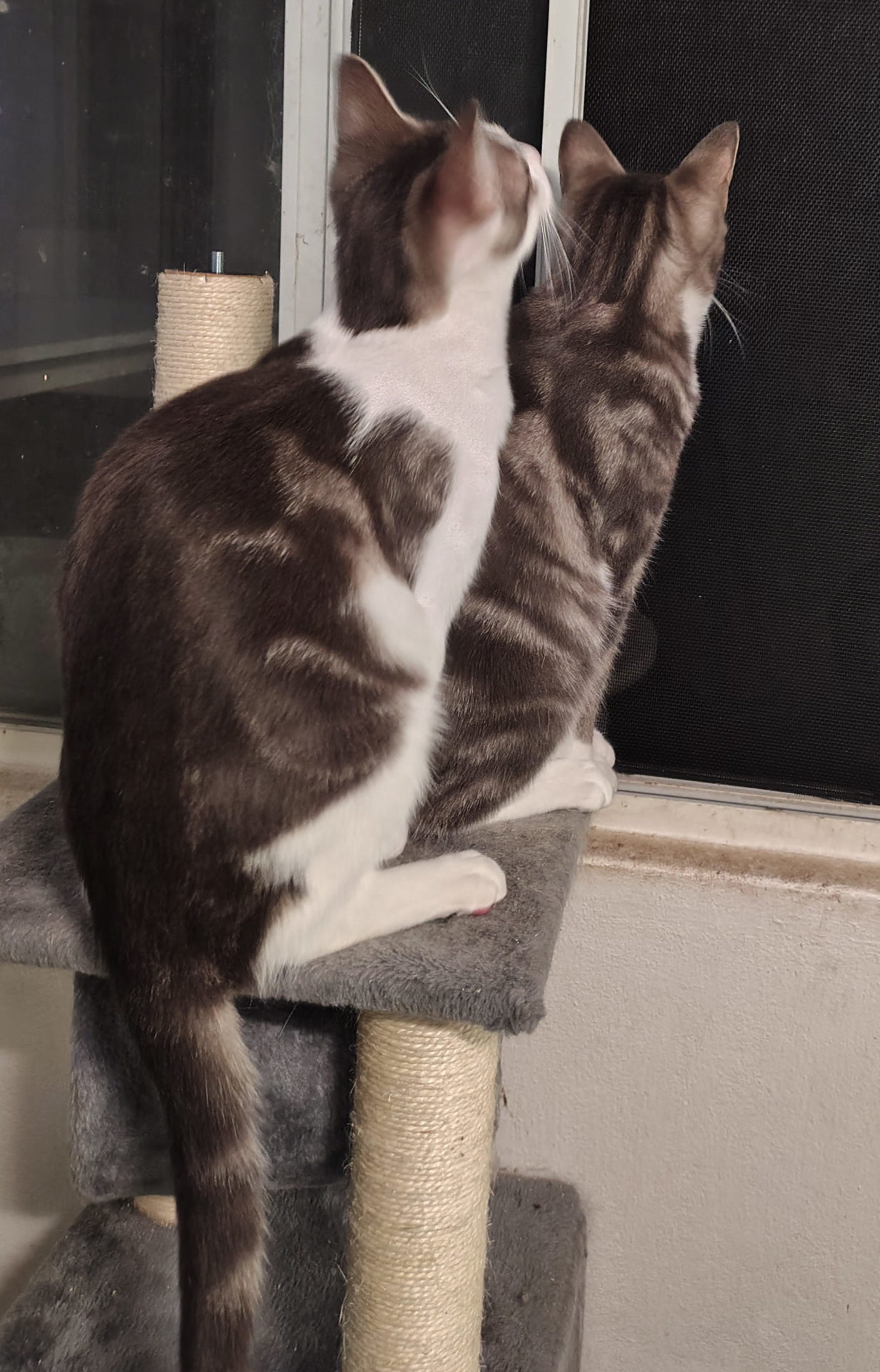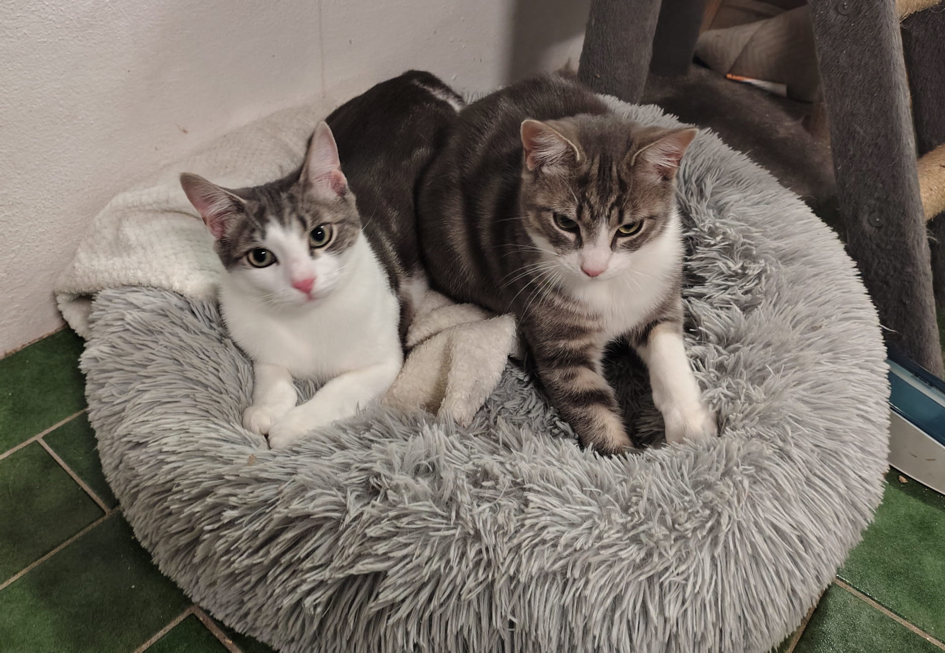 They are a bonded pair and must go together. They have a beautiful, gentle nature. Skippy is more outgoing and confident and Siggy is becoming more confident but is the more timid of the two. They take a little while to warm up to new people but when they are comfortable they yearn for your attention. They can be picked up but are not really lap cats.