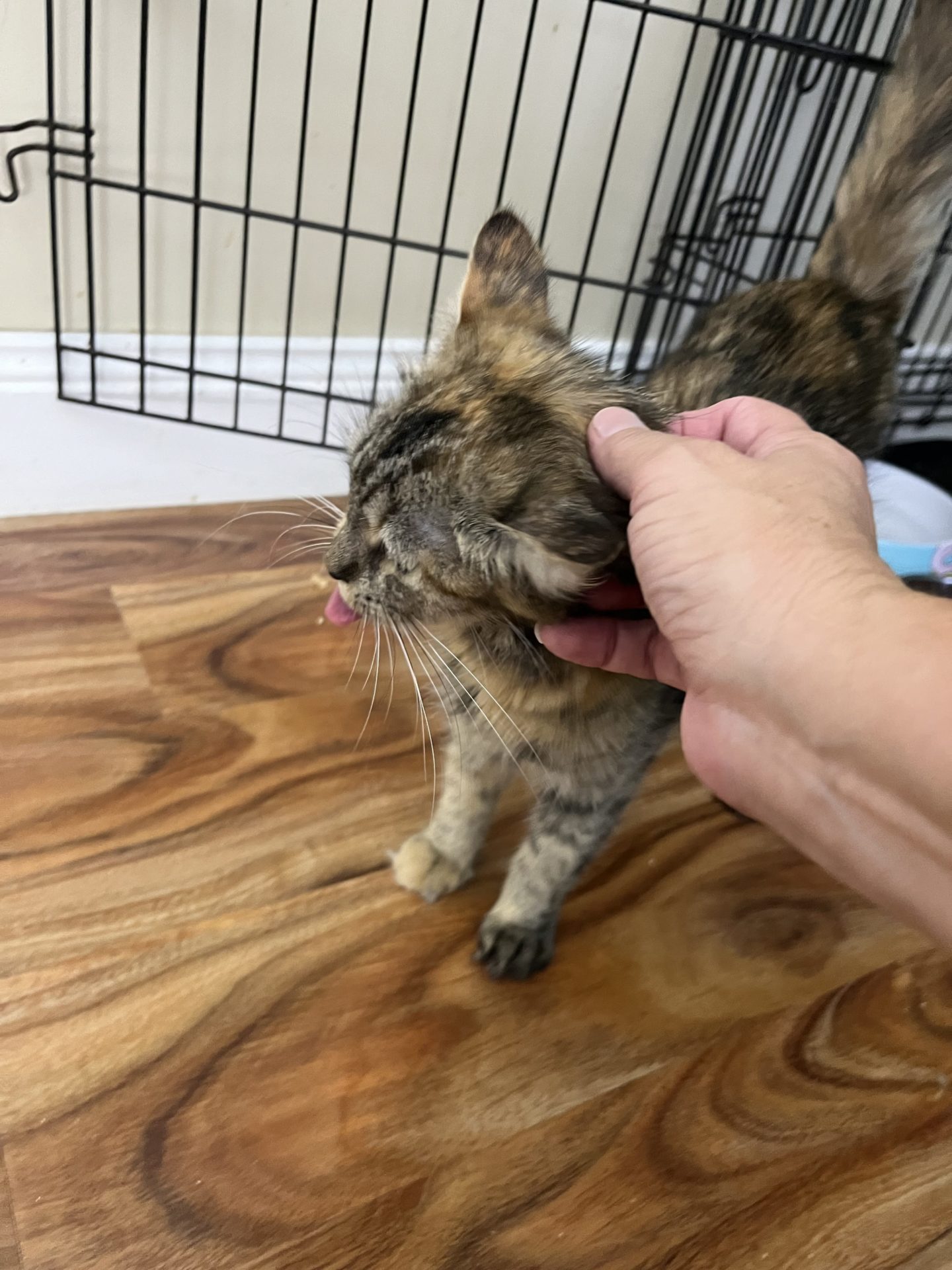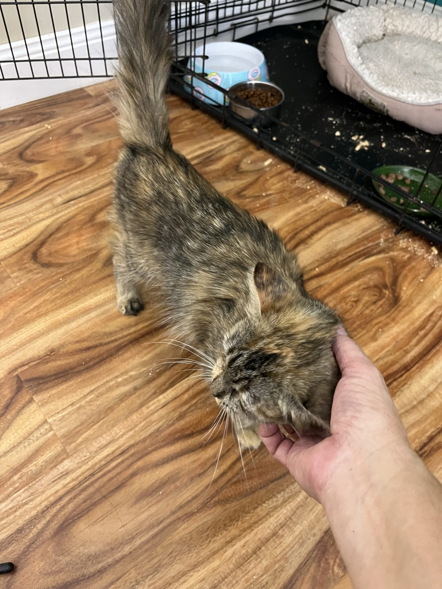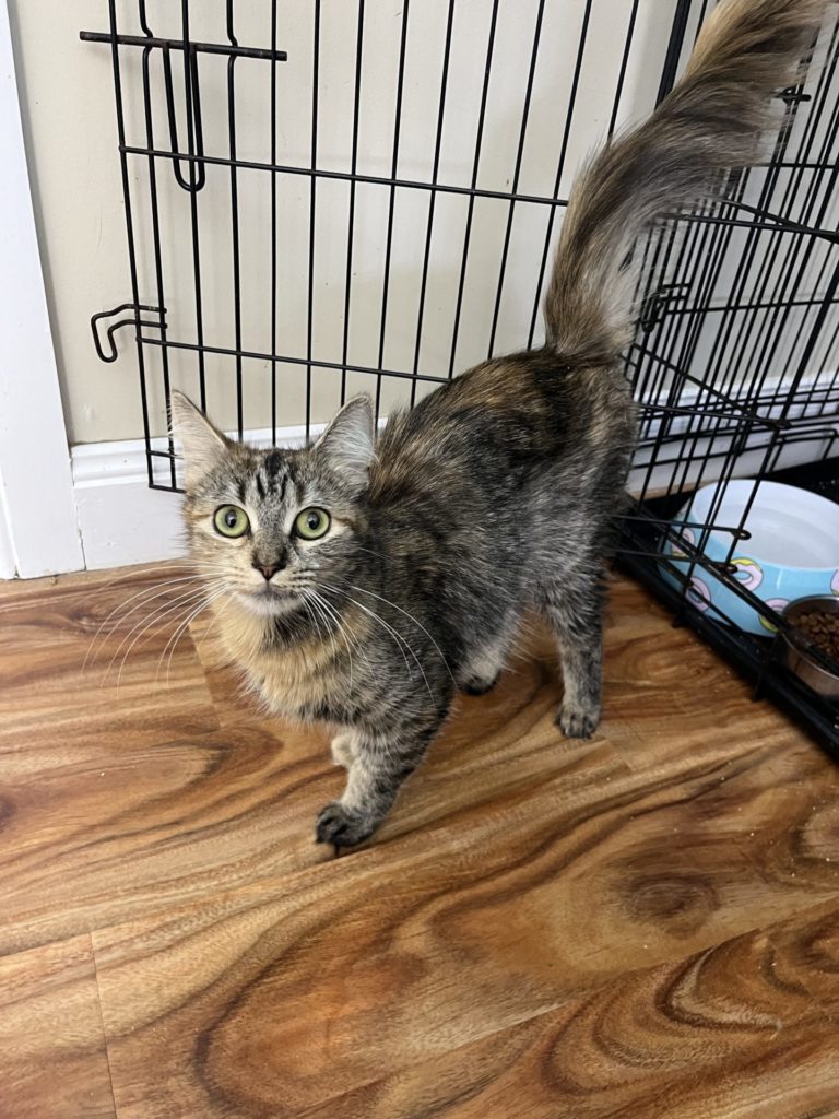 All About Me and My Unique Personality: Snickers is a gentle girl she came into care shut down and sat still only eating in the dark of the night she has now evolved into a gentle smoochy girl she enjoys rubbing on you loves an ear scratch and being stroked she will walk back and forth loving attention she loves her food she is still a bit underweight but gaining well. Snickers has had her vet work done and is ready for her next chapter to find her forever home