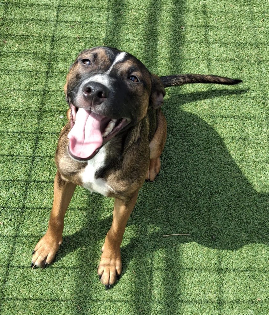 We believe she is approximately 6 months old, we think she is a English staffy cross